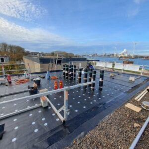 Dakrenovatie in Velzen-Zuid Voor deze grote woning met een dakoppervlak van ongeveer 80 m² hebben wij een complete dakrenovatie uitgevoerd. Het dak is voorzien van een nieuwe tweelaags bitumen dakbedekking met zwarte leislag. Het oude dakgrind en de mastiek dakbedekking zijn verwijderd en afgevoerd. Alle af- en doorvoeren zijn vernieuwd. Het dak is afgewerkt met een nieuwe aluminium daktrim.
