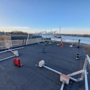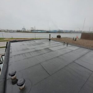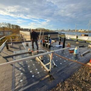 Het oude dakgrind en de mastiek dakbedekking zijn verwijderd en afgevoerd. Alle af- en doorvoeren zijn vernieuwd. Het dak is afgewerkt met een nieuwe aluminium daktrim.