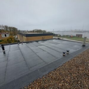 Voor deze grote woning met een dakoppervlak van ongeveer 80 m² hebben wij een complete dakrenovatie uitgevoerd. Het dak is voorzien van een nieuwe tweelaags bitumen dakbedekking met zwarte leislag.